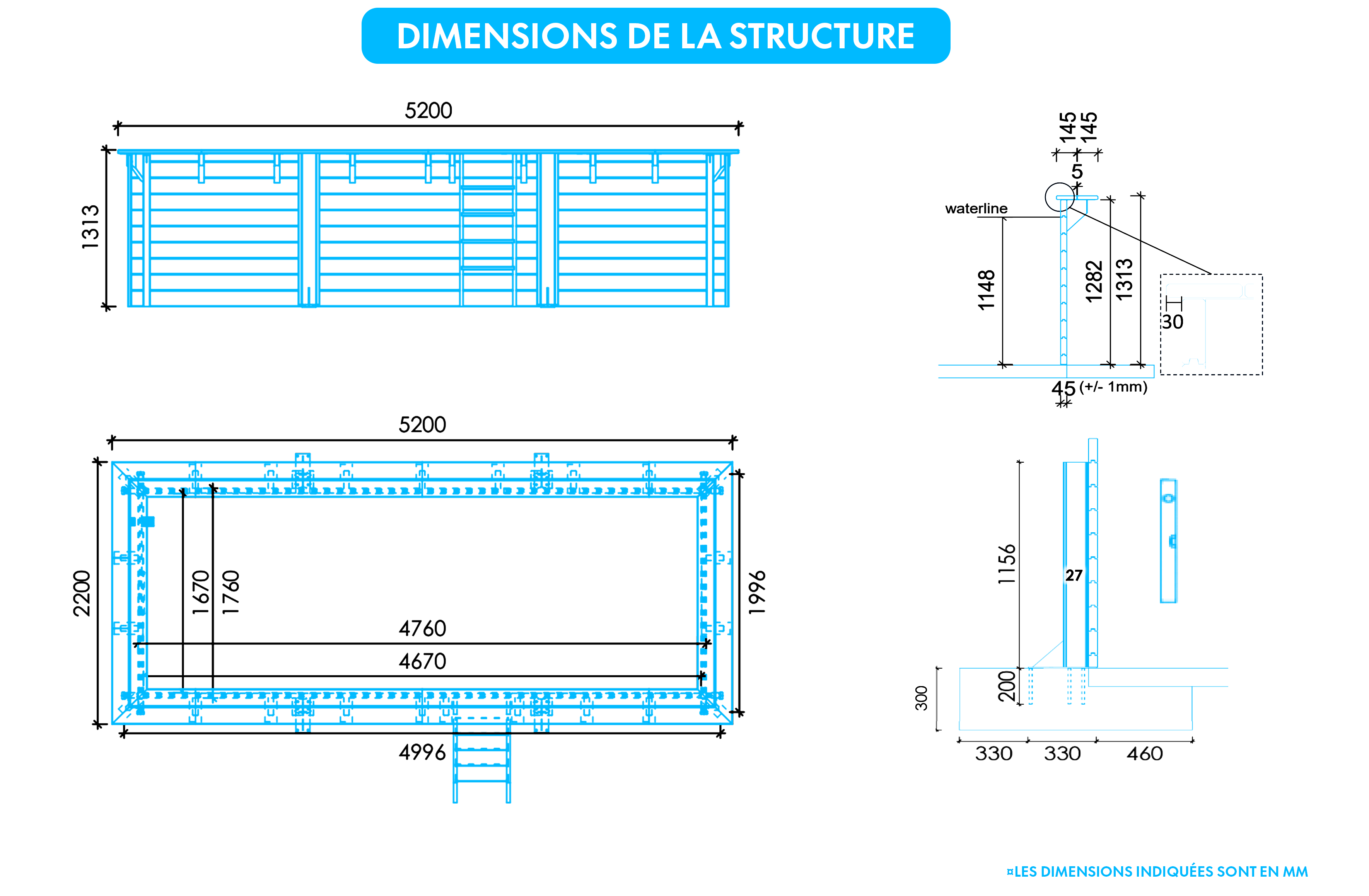 Laissez-vous séduire par cette Piscine Bois California Rectangulaire LUXE dimensionnée à 520x220x131 cm, agrémentée d'un escalier et d'une plage immergée façon pierre de Bali ! Ce bassin en kit très simple à installer sera la source de joie pour petits et grands, avec une structure garantie 15 ans et un liner garanti 10 ans sur les soudures.